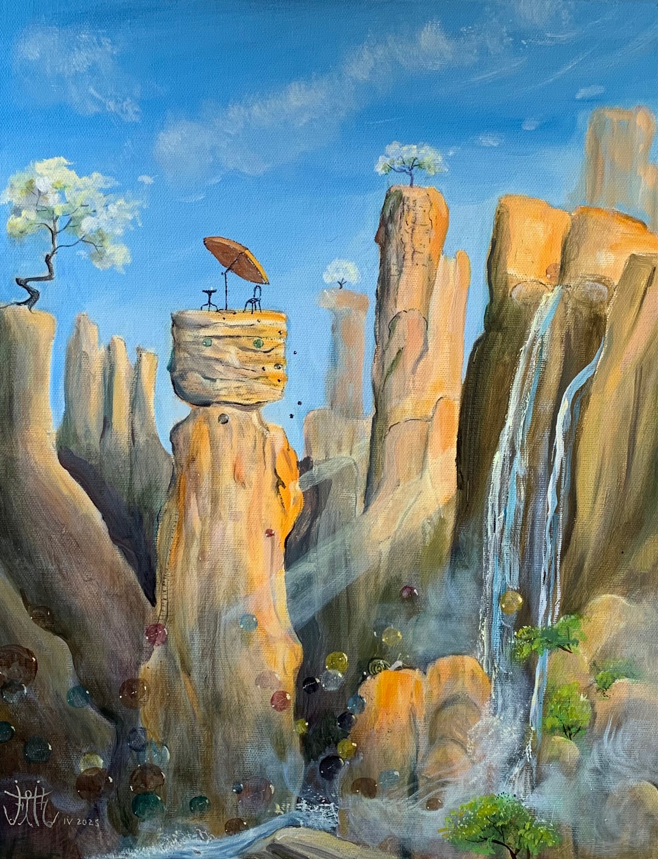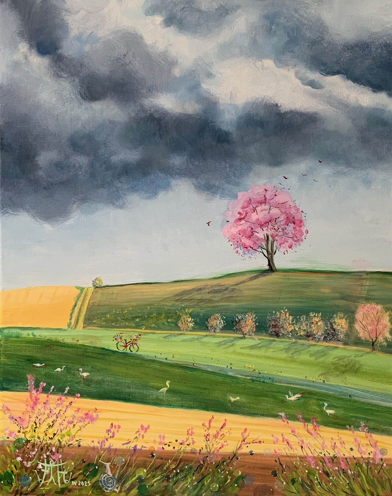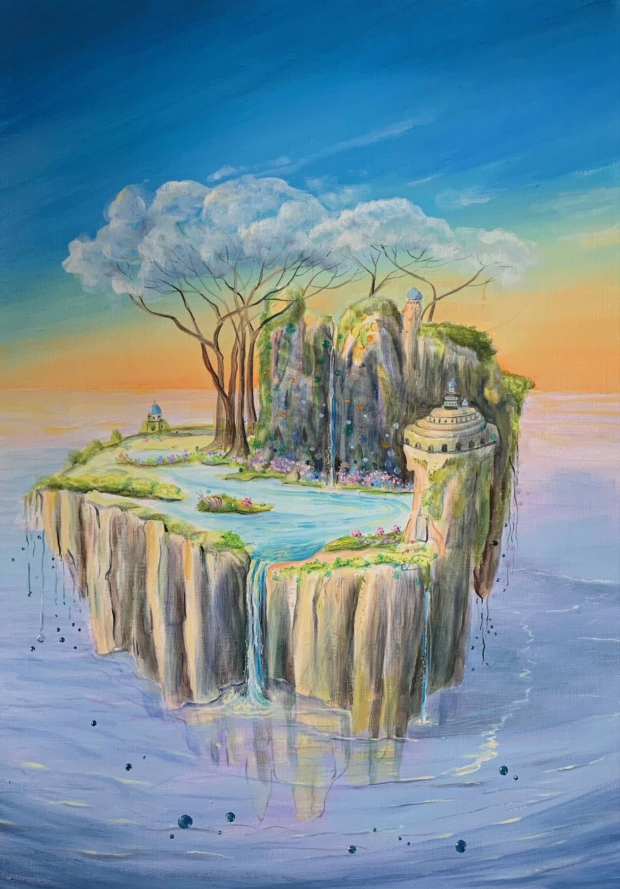 Ma peinture développe un univers fantastique, onirique, féérique et humoristique où se mêlent des éléments d’actualité et de voyage.