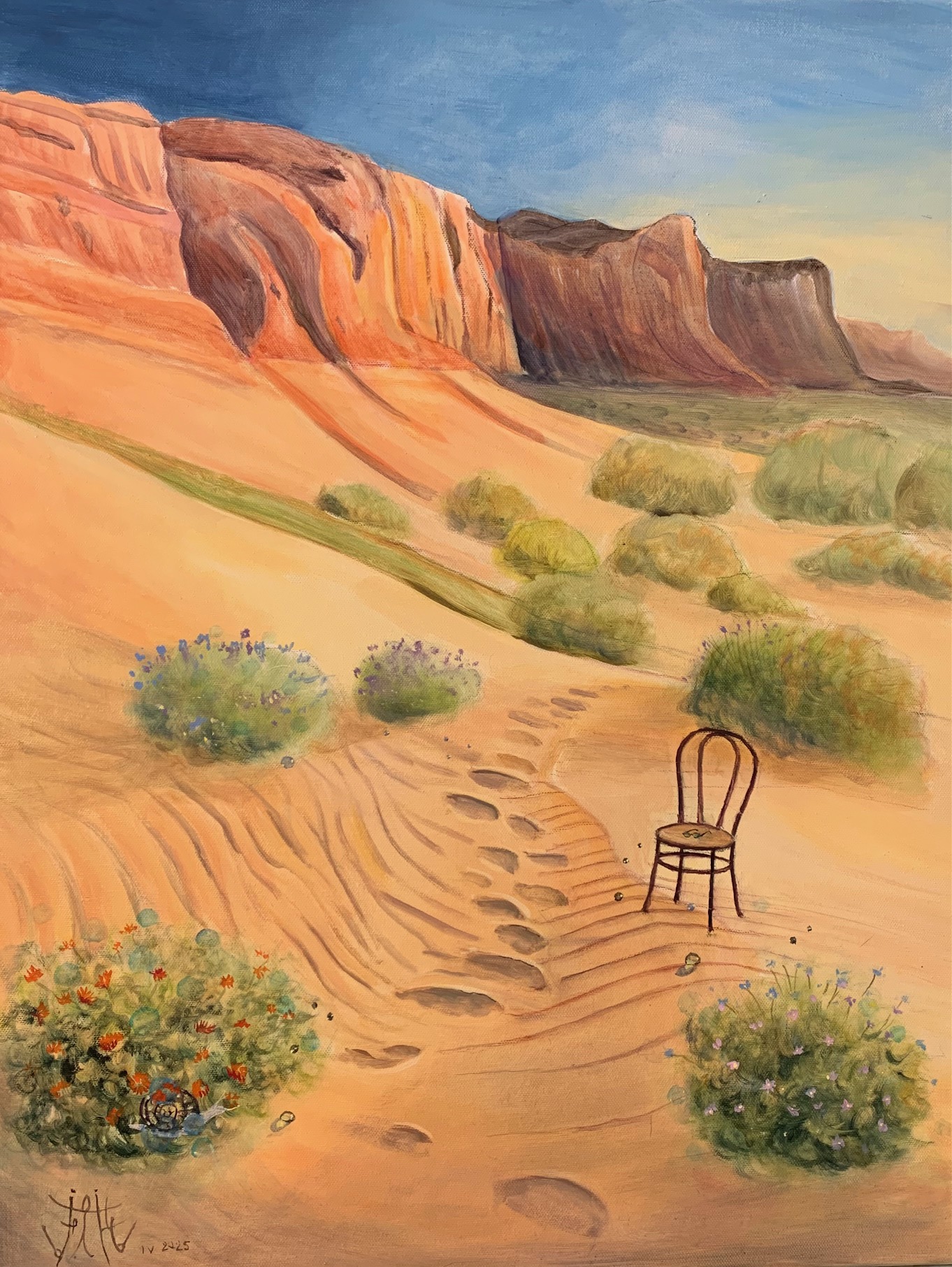 Des escargots, apologie de la lenteur, sont dissimulés dans chaque œuvre et côtoient de façon inattendue les lunettes du peintre.