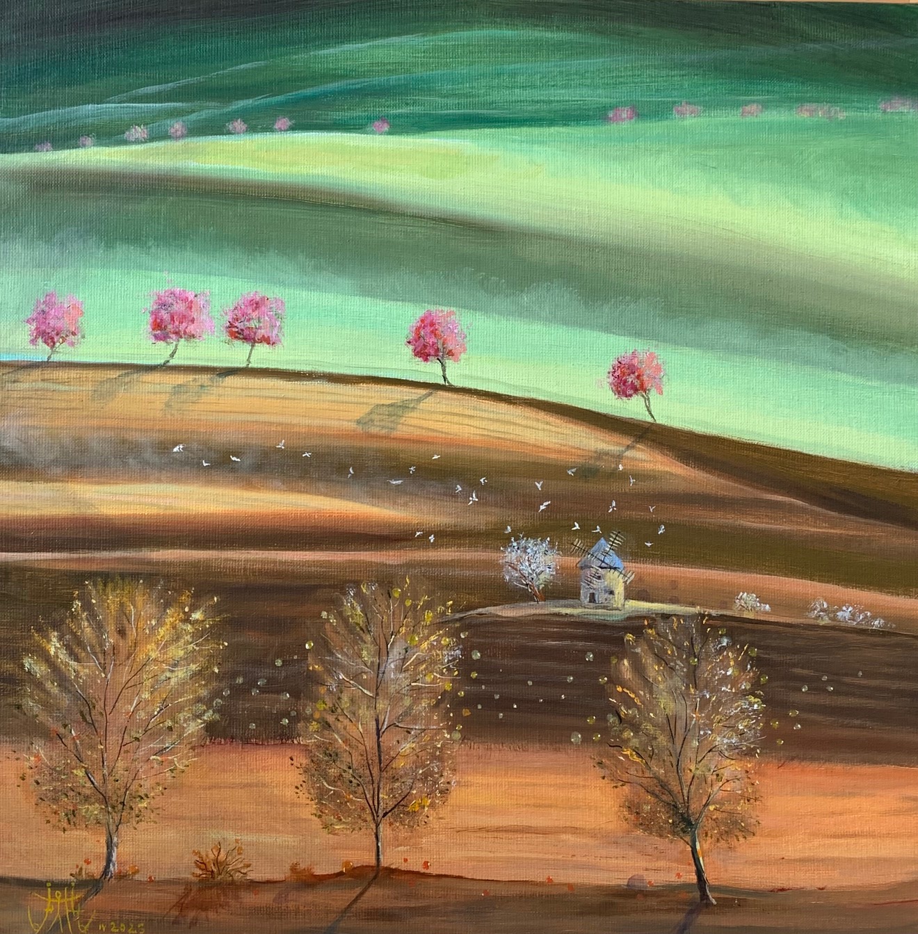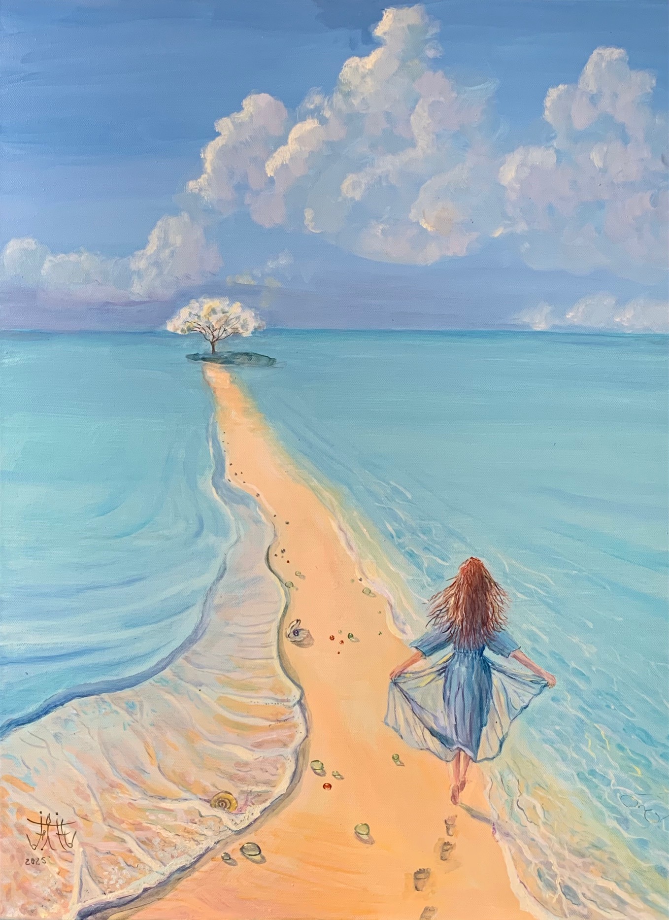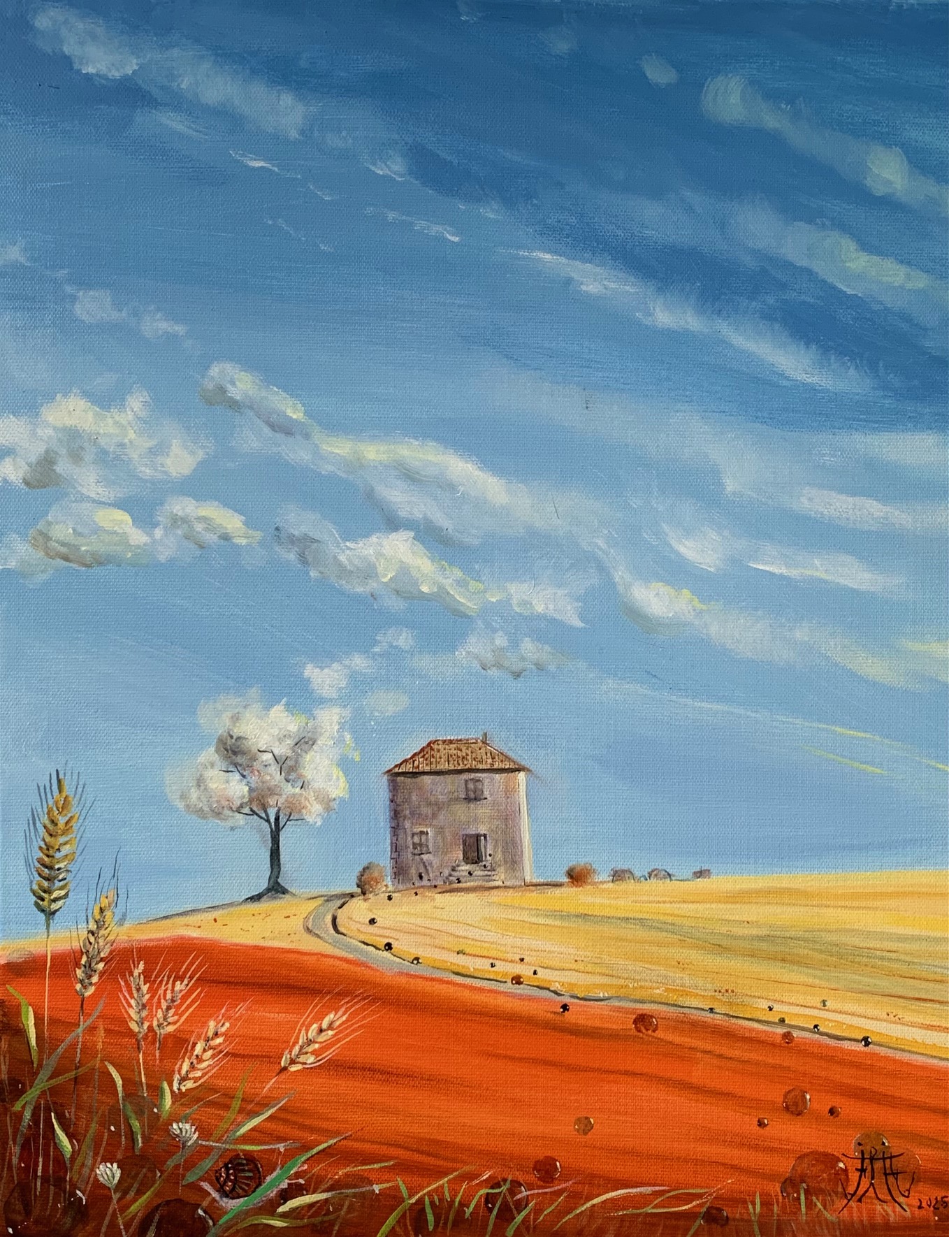 L’huile et l’aquarelle sont mes moyens d’expression favoris. La réalisation sur toile se fait progressivement et se termine par une succession de glacis. Des rehauts de matière existent cependant : utilisation de « color shaper », impressions, légers ponçages.