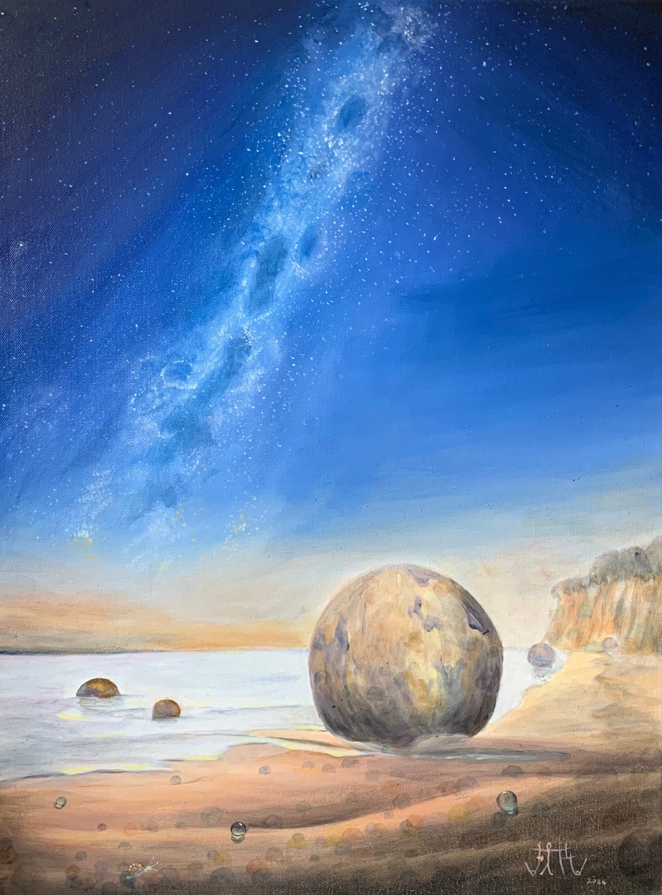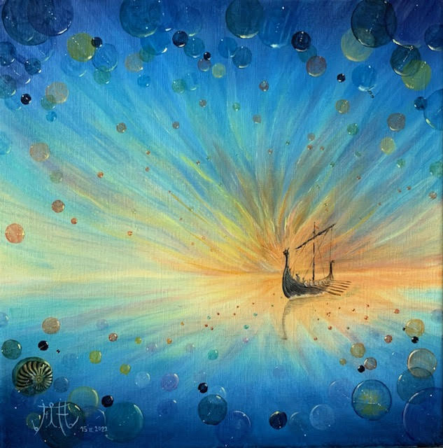 Des bulles peintes en glacis successifs s’amoncellent créant un monde transparent d’une autre dimension où le réel et l’imaginaire semblent se disputer tout en se complétant harmonieusement par le jeu des couleurs